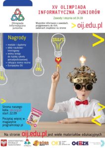 Ministerstwo Edukacji Narodowej, Fundacja Rozwoju Informatyki i Komitet Główny Olimpiady Informatycznej Juniorów informują o rozpoczynających się zawodach I stopnia XV Olimpiady Informatycznej Juniorów przeznaczonej dla uczniów szkół podstawowych. Olimpiada jest przeznaczona w sposób szczególny dla najzdolniejszej i samodzielnie pracującej w tej dziedzinie młodzieży i ma służyć rozwijaniu zainteresowań informatycznych. Informacje można znaleźć [tutaj].