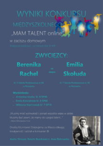 Serdecznie gratulujemy wszystkim uczestnikom udziału w Międzyszkolnym Konkursie „MAM TALENT online” w zaciszu domowym organizowanym przez Szkołę Podstawową nr 66 im. Marii Skłodowskiej-Curie w Poznaniu.