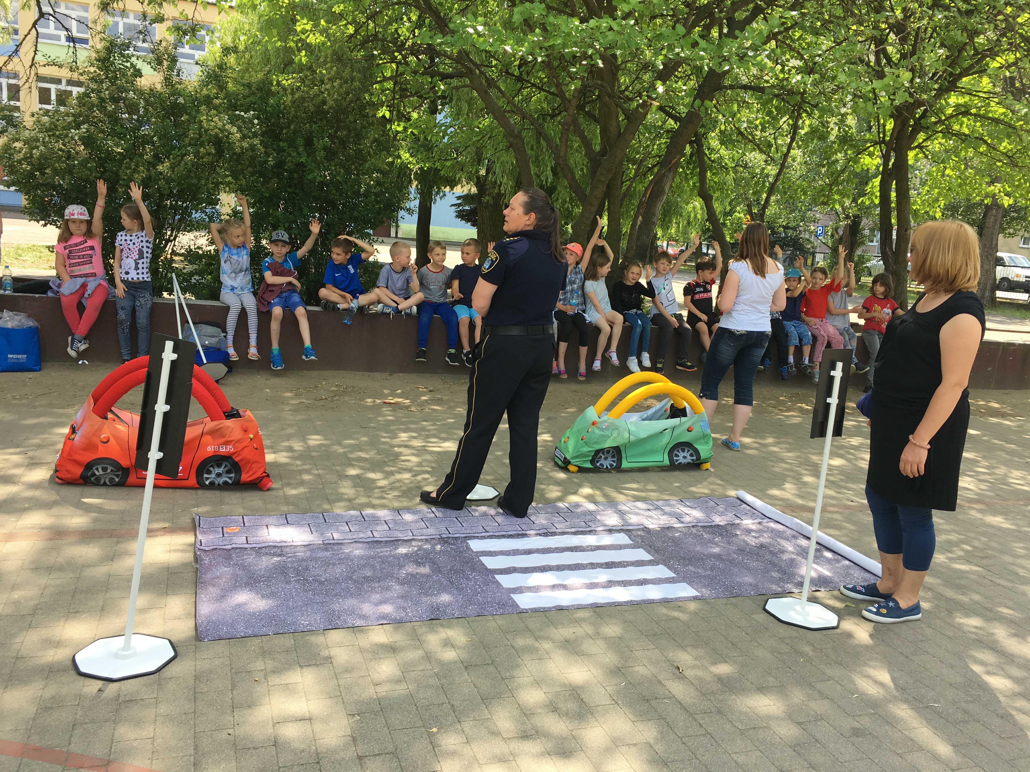 Pod koniec maja odbyło się ostatnie w tym roku spotkanie z p. Edytą Macutkiewicz – strażnikiem miejskim, poświęcone ćwiczeniom praktycznym w przechodzeniu przez jezdnię. Tym razem pani Edycie towarzyszyła pani z Wojewódzkiego Ośrodka Ruchu Drogowego. Pod czujnym okiem ekspertów, uczniowie wcielali się w role pojazdów, znaków drogowych i oczywiście pieszych. Jak widać na zdjęciach, panie też miały okazję poćwiczyć 🙂 .A na zakończenie cyklu spotkań, na ręce pani wicedyrektor zostały przekazane kamizelki odblaskowe dla uczniów 🙂 🙂 🙂